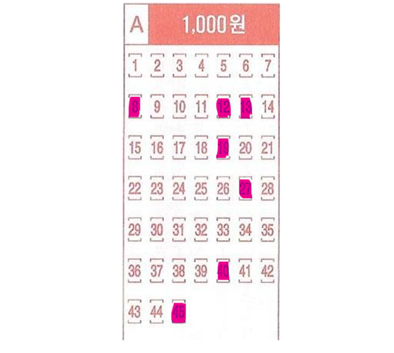 로또구매용지에 보너스번호 12를 포함해서 7개를 그려보아도 특별한 패턴이 보이지 않습니다.