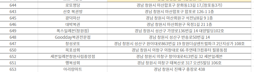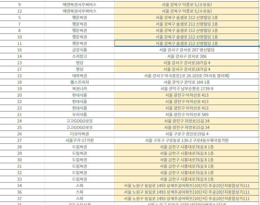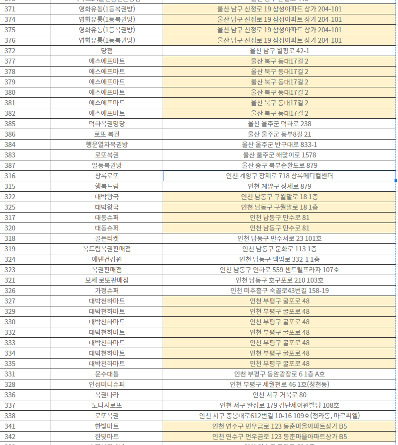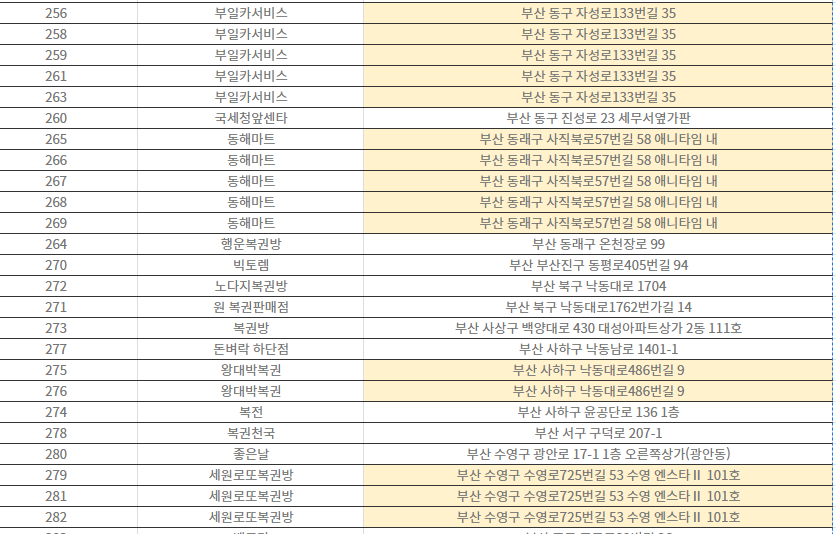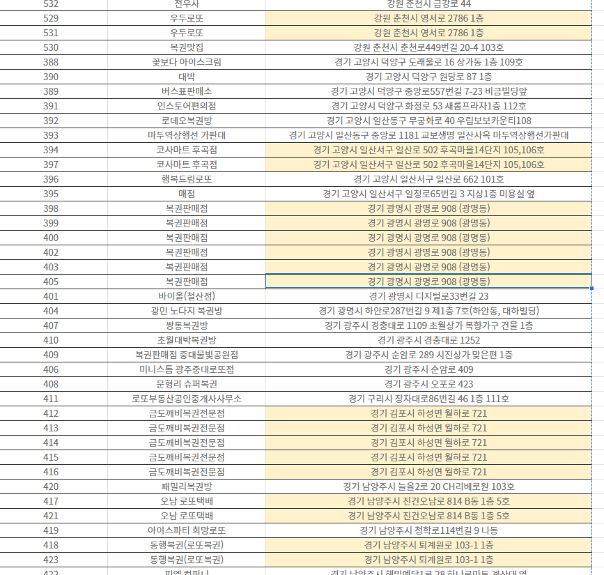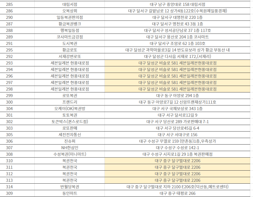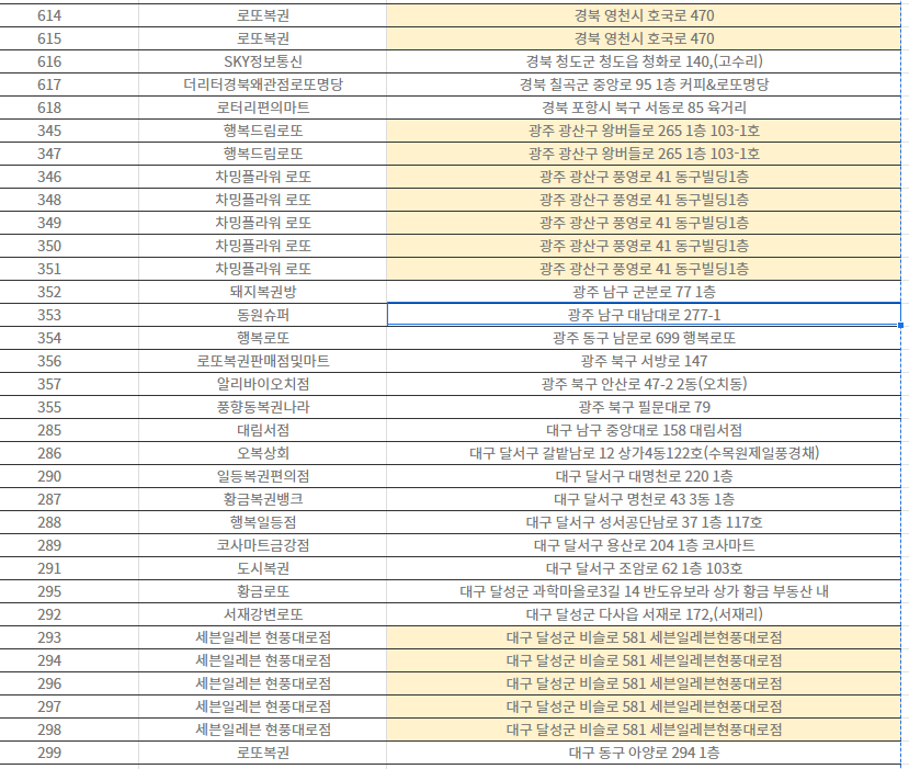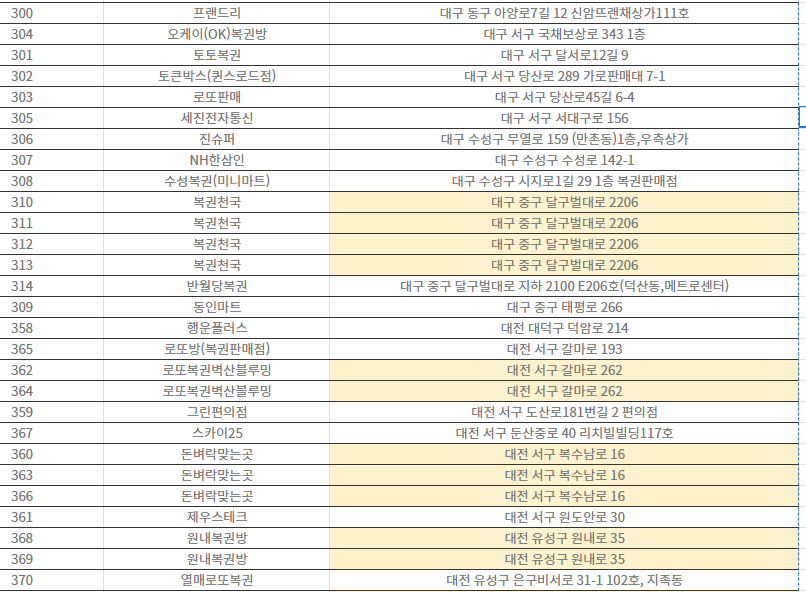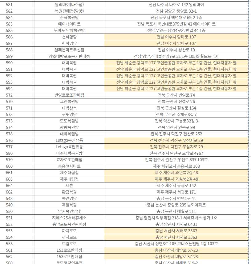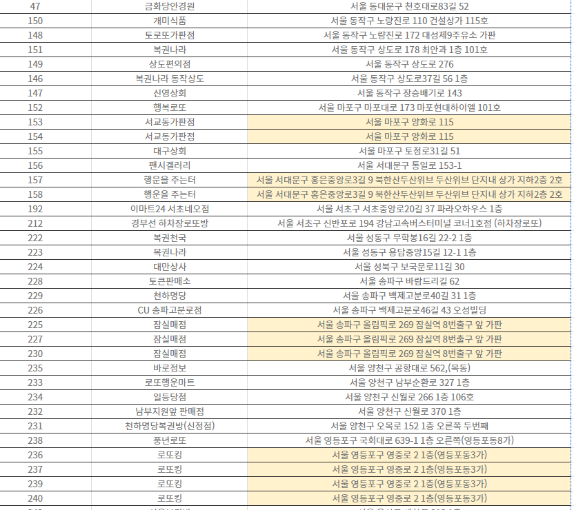 (주소로 정렬되어 있어서 번호는 순서가 섞였습니다. 내용이 많아 중복 당첨점 위주로 조금씩 잘랐습니다. )