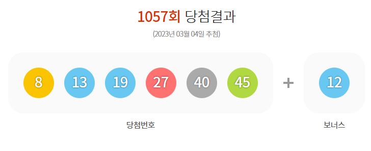 로또 1057회 1등 당첨번호 8, 13, 19, 27, 40, 45 + 보너스번호 12