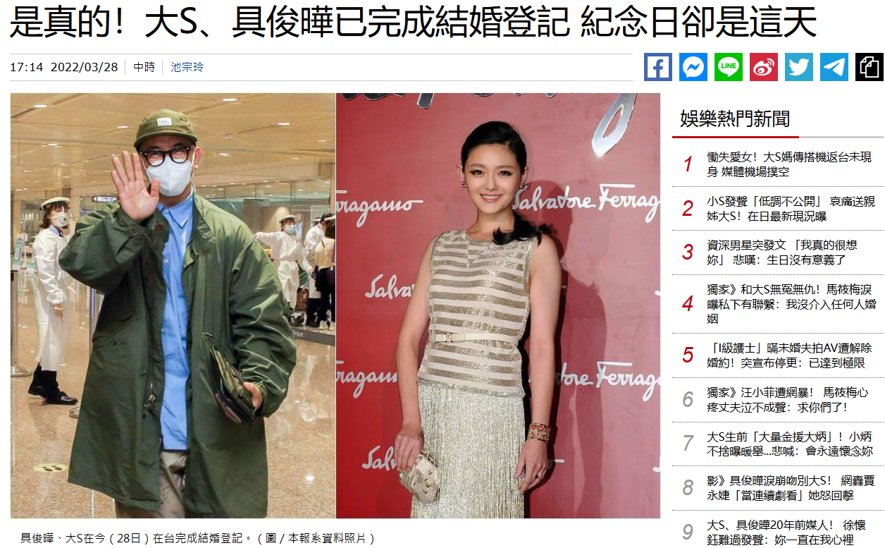대만 뉴스기사 是真的!大S、具俊曄已完成結婚登記 紀念日卻是這天 - 娛樂 - 中時
